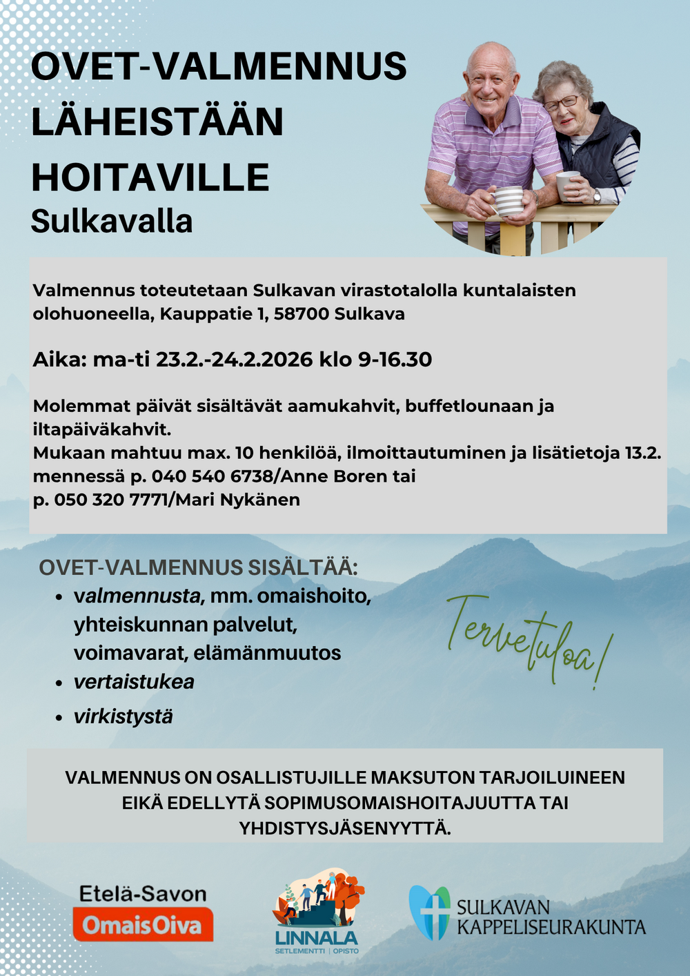 OVET-VALMENNUS LÄHEISTÄÄN HOITAVILLE Sulkavalla Molemmat päivät sisältävät aamukahvit, buffetlounaan ja iltapäiväkahvit. OVET-VALMENNUS SISÄLTÄÄ: - valmennusta, mm. omaishoito, - yhteiskunnan…